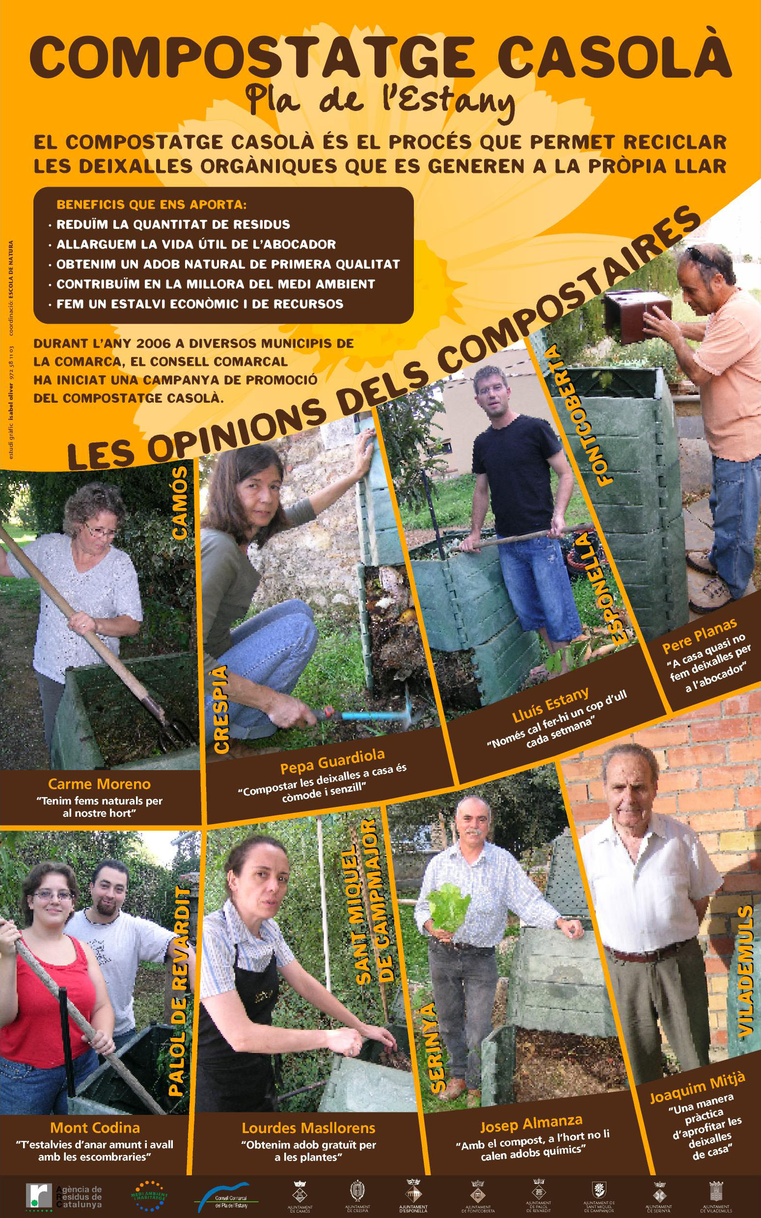 Tenint en compte que aproximadament un 30% dels habitatges de la comarca són de tipus unifamiliar, la ràtio compostador per habitatge unifamiliar arriba al 15% aproximadament. Davant l’èxit de les campanyes d’autocompostatge al Pla de l’Estany durant aquests anys s'ha incidit especialment en aquells nuclis més rurals i disseminats, on la recollida de contenidors en AA presenta una major dificultat. Actualment els residus orgànics representen el 38% en pes dels residus que generen les llars catalanes. Si s’aconseguís entre tots reduir aquesta important fracció de residus allargaríem de manera considerable la vida útil de l’abocador comarcal. Les campanyes que s'han anat realitzant des de 2006 han consistit en la realització de tallers als diferents municipis, guiats per un monitor especialista en compostatge, on s’explicava el què es pot compostar, quina utilitat té fer compostatge casolà, de què se’n pot fer i quins són els trucs perquè surti amb una certa qualitat. Cal dir que l’acceptació de les campanyes aquests anys ha estat notable ja que en la primera fase es van esgotar els 75 compostadors subvencionats i molta gent va quedar en llista d’espera per obtenir-ne un. Per aquest motiu el consell Comarcal va valorar la possibilitat d’ampliar la campanya en una segona fase i així acabar de completar el desplegament del compostatge casolà a tota la comarca. Els usuaris que volien disposar d’un compostador havien de pagar un preu públic de 20 euros per als compostadors de 400 litres i de 40 euros per als de 700 litres ja que la resta anava a càrrec de l’Agència de Residus de Catalunya, el Consell Comarcal del Pla de l’Estany i el propi Ajuntament. Posteriorment al taller de compostatge el tècnic realitza unes visites de seguiment als compostaires amb l’objectiu de conèixer el funcionament dels compostadors i resoldre dubtes. Què és el compost? El compost és el resultat de la fermentació natural de les restes vegetals. Aquesta fermentació es idèntica a la que es produeix al bosc. És per tant un adob natural que s’utilitza tant en jardineria com en horticultura. Què es pot compostar? • Restes de fruita i verdura • Restes de carn i peix (amb moderació) • Closques d’ou, marisc i fruits secs • Paper de cuina • Taps de suro • Bossetes d’infusions i marro de cafè • Restes de jardineria i horta Ocupa molt de lloc el compostador? No .Cap en qualsevol racó del jardí i només hem de procurar que estigui assentat directament a la terra. Porta molta feina? No. Només cal separar les restes orgàniques de la cuina i les restes del jardí i portar-les al compostador. Què passa quan s’omple el compostador? El compostador no s’omple mai perquè durant el procés de compostatge , les restes orgàniques perden un 80% del seu volum. A més, buidem el compost elaborat a mida que el necesitem.El compost s’utilitza exactament igual que la terra vegetal, però té més avantatges: - Regula la humitat i el ph del sòl - És un adob de primera qualitat - Millora la salut de les plantes - És ecològic